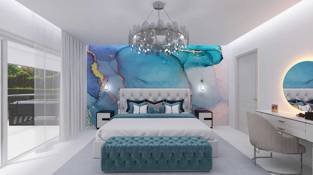 To achieve this, we started with the feature wall behind the bed. We chose a blue-pink-purple marble wall mural that adds a dramatic, yet luxurious touch.