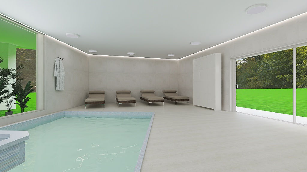 To achieve this, we started by designing a custom pool as the centerpiece of the outdoor area. The pool gradually gets deeper, and includes a jacuzzi zone with incorporated water pumps. We added a small waterfall feature at one end to provide soothing sounds and visual interest. Surrounding the pool, we placed luxurious lounge chairs with weather-resistant cushions in neutral tones, perfect for sunbathing or relaxing with a book. We have added a pergola to provide shade in hot sunny days with sunbeds underneath. We have incorporated a square shaped built-in seating area, that was covered with marble stones. To create a magical night ambience we have added an outdoor fireplace in the center of the seating area.