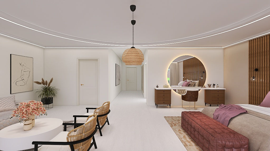 To achieve this, we started with a light, airy color palette inspired by the beach. We used soft whites, sandy beiges, and turquoise throughout the apartment to create a sense of continuity and calm. The open-plan kitchen, living, and dining area became the heart of the home, designed to be both stylish and practical. In the kitchen, we chose handleless cabinets in a light wooden finish paired with dark countertops. A kitchen island with seating was added, perfect for family meals or entertaining guests. The island also features hidden storage solutions, ensuring the kitchen remains clutter-free. The living room is a cozy yet stylish space centered around an ivory sofa with clean, modern lines. We designed a feature TV wall with built-in storage in a combination of dark wooden tones and light marble, creating a striking focal point. The TV is seamlessly integrated into the design, with hidden cable management to maintain the clean aesthetic. To add warmth and texture, we layered the space with a large area rug and soft, flowing curtains in a light fabric, To fill the white space we have added abstract artwork above the sofa. A round coffee table and a side table at the entrance complete the look, adding functionality without overwhelming the space. The master bedroom is luxurious, designed for relaxation. We added a built-in fireplace creating a cozy focal point. A vanity wall with built in shelf like table and with a large mirror integrated with LED lighting that provides a functional space for getting ready. We added plush bedding in neutral tones and dusty pink to add a touch of elegance. The guest bedroom features wainscoting behind the bed with incorporated textured wallpaper, creating a sense of depth and interest. We chose a turquoise velvet bed as the centrepiece, adding a pop of color that ties in with the coastal theme. LED lights were installed to highlight the textured wallpaper and create a warm, inviting ambiance. The teenage girl’s room is a playful yet stylish space. We used textured wall paint to add depth and interest, and a study corner with a desk and shelves provides a functional workspace. A stylish moon-shaped floor lamp adds a whimsical touch. The master bathroom is a spa-like retreat with a large shower and a freestanding tub. We used dark patterned marble for the shower zone and wood-like floor tiles to create a luxurious yet natural feel. The small suite features a small, round-shaped sink and a compact tub, making the most of the limited space while maintaining a cohesive design. The balcony was transformed into an outdoor living space, with comfortable seating, potted plants and a hanging chair for extra fun. The result is a bright, modern apartment perfect for both relaxing and entertaining.